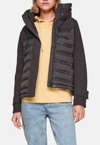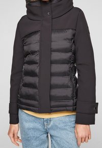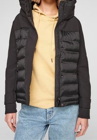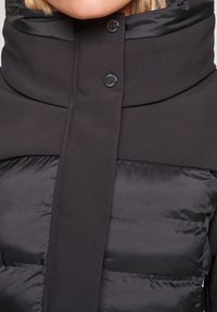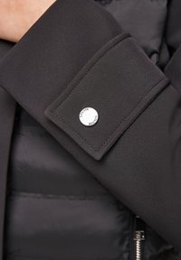 Veste en doudoune noire avec un haut en tissu doux, capuche et poches latérales zippées. Elle dispose d'une fermeture à bouton et d'accents aux poignets.