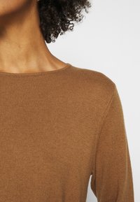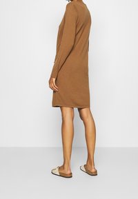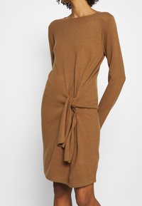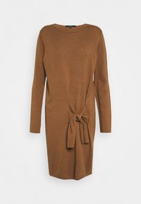 Robe en maille marron à manches longues et col bateau, avec un détail de nœud à la taille. Texture lisse, longueur mi-cuisse.