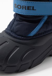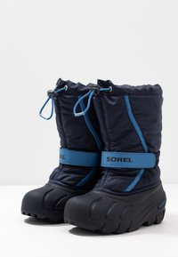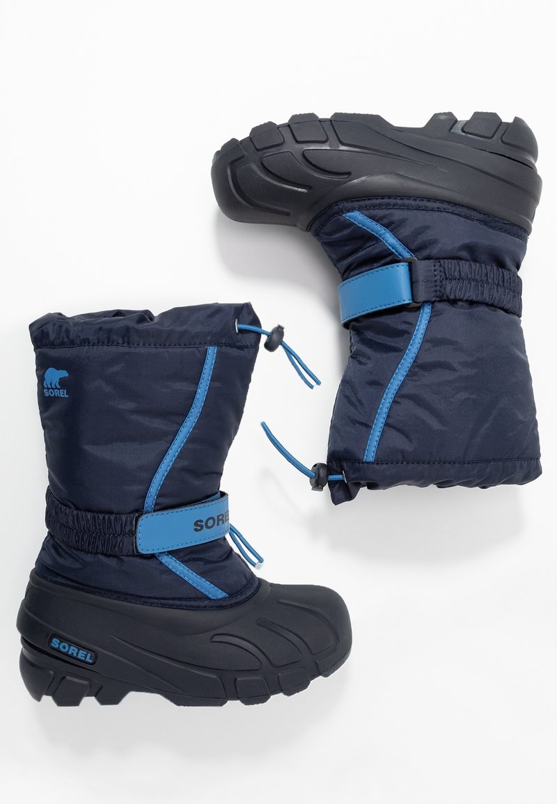 Paire de bottes d'hiver isolées bleu marine et noires avec semelles épaisses, sangles réglables et fermetures à cordon, conçues pour le temps froid.