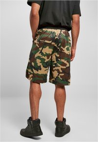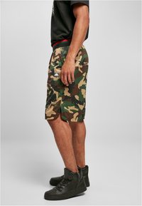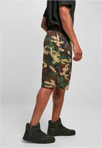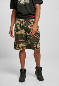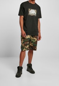 Shorts camouflage dans plusieurs nuances de vert et de marron, avec une taille élastique et des poches latérales, assortis à des baskets montantes noires.