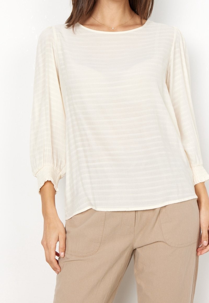 Haut à rayures blanches avec des manches longues légèrement bouffantes et des poignets élastiques, assorti à un pantalon beige clair ; texture douce et coupe décontractée.
