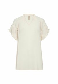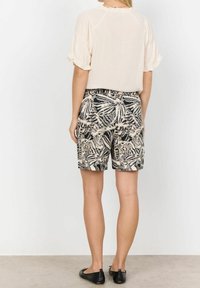 Femme portant un chemisier blanc à manches courtes avec un col en V festonné et un pantalon à motifs abstraits noir et blanc noué à la taille.