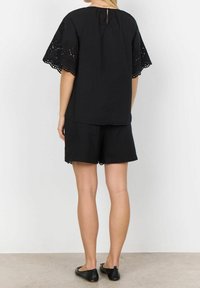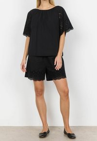 Haut noir avec des accents en dentelle brodée sur les manches courtes, un col rond et une coupe ample, assorti à un short noir assorti présentant des détails similaires.