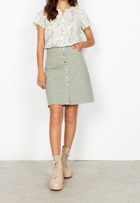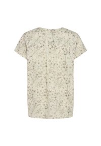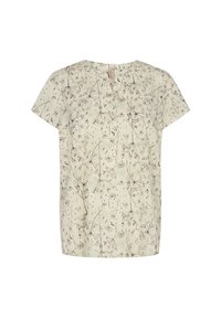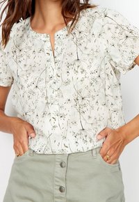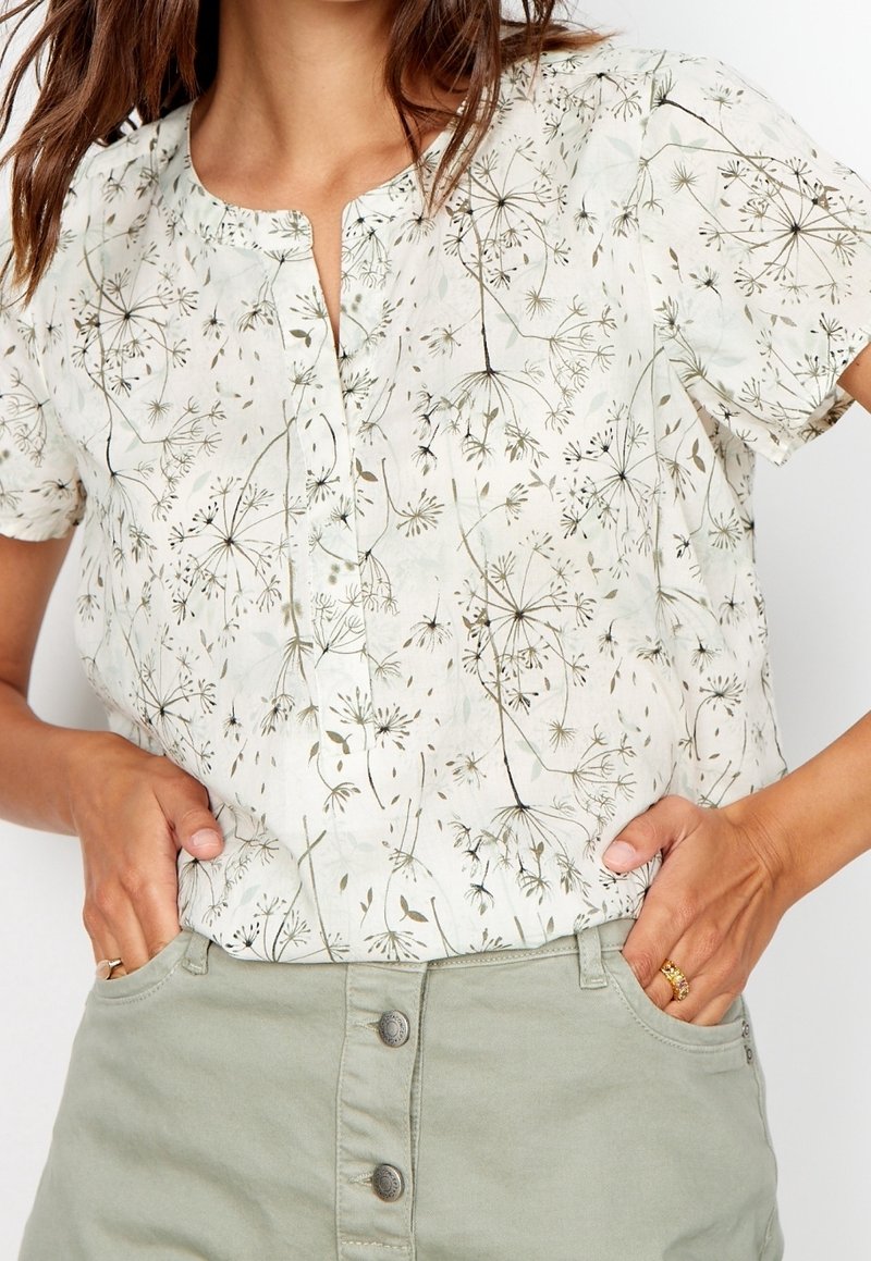 Blouse blanche à manches courtes avec un imprimé botanique comprenant des fleurs vertes et grises. Patte de boutonnage et coupe décontractée, associée à un pantalon vert.