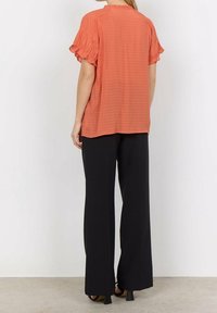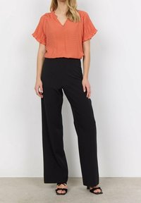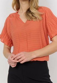 Blouse corail à col en V avec manches courtes plissées, dotée d'un tissu texturé et de fines rayures verticales, portée avec un pantalon noir.
