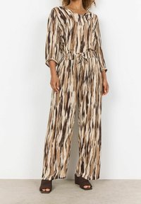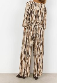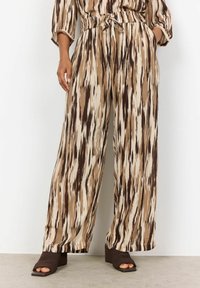 Femme portant un pantalon ample taille haute avec un motif abstrait vertical marron, crème et noir, ainsi que des sandales à talons ouvertes marron.