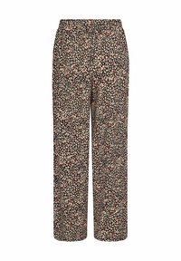 Un pantalon large à fleurs noires présente une taille à cordon, un tissu léger et un motif de petites fleurs multicolores.