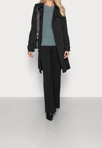 Pull bleu texturé avec un col rond et des manches ballon, fabriqué dans un matériau doux, associé à un pantalon noir.