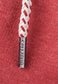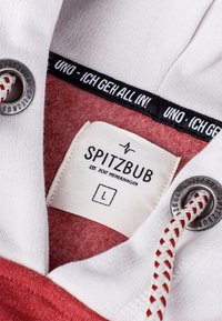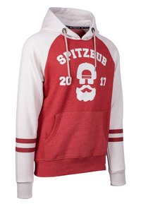 Sweat à capuche rouge et blanc avec poche avant, cordons, et un graphisme représentant une casquette, une barbe, une moustache, ainsi que le texte "SPITZBUB 2017" sur la poitrine.