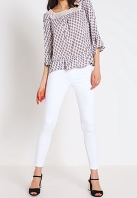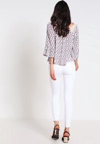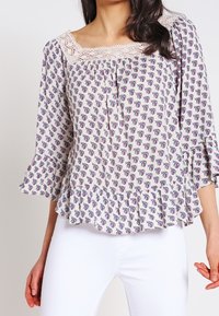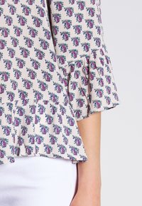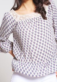 Blouse à imprimé floral avec des manches évasées, dotée d'un décolleté en dentelle carrée. Base principalement crème avec des accents violets et verts. Ourlet en volant.