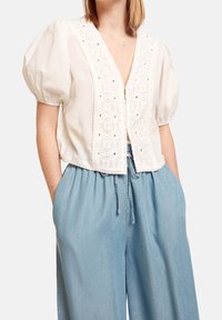 Pantalon large bleu clair en denim, doté d'une taille élastique froncée avec un cordon de serrage, et des poches latérales.