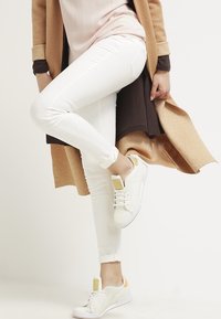 Jean blanc ajusté en denim avec une texture lisse, doté de cinq poches et d'un revers, associé à des baskets blanches avec des accents jaunes.
