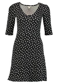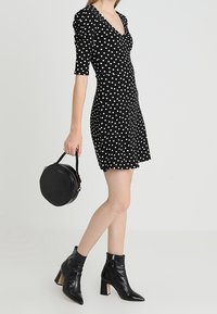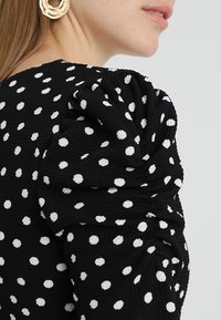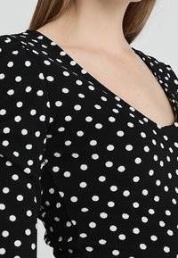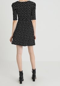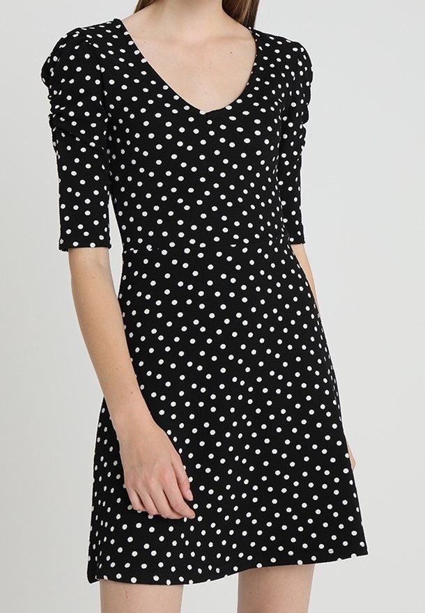 Robe noire à pois blancs, décolleté en V, manches courtes bouffantes, corsage ajusté, jupe évasée, texture de tissu lisse.