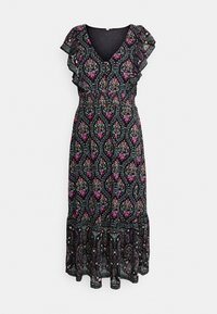 Femme portant une robe midi noire ornée de motifs floraux colorés et de motifs cachemire, manches volantées, col en V, associée à des bottines noires.
