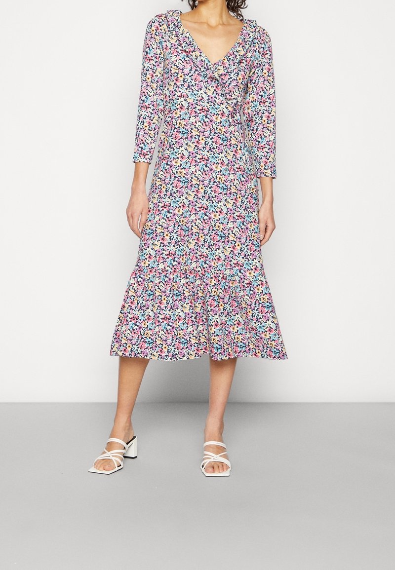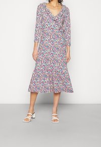 Robe midi florale avec un design enroulé, présentant des motifs vibrants de rose, bleu et jaune sur un fond clair, un col à volants et des manches trois-quarts.