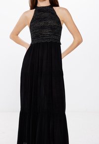 Robe maxi noire à dos nu avec un corsage ajusté à côtes et une jupe fluide à plusieurs couches. Texture lisse, tissu léger et longueur cheville.