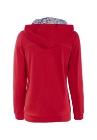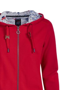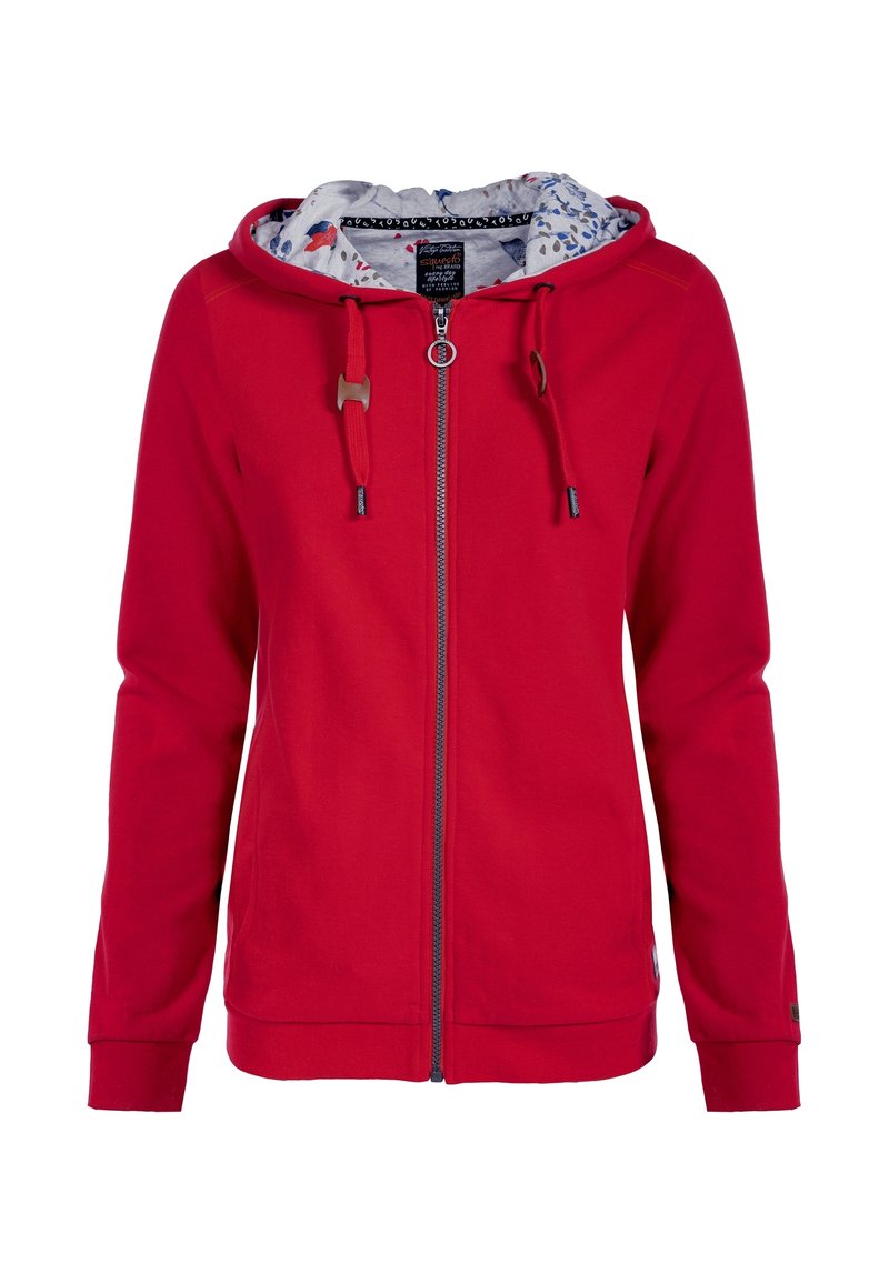 Sweat à capuche rouge zippé, en coton. Comprend une doublure à motif dans la capuche, une fermeture à cordon et des poignets et ourlet côtelés.