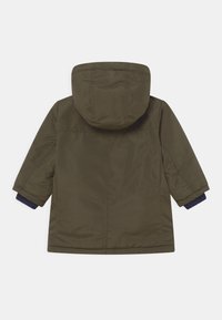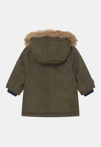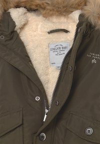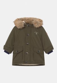 Parka olive pour enfant avec capuche bordée de fourrure, fermeture à boutons, poches à rabat, et texte "Explore la forêt !" sur la poitrine.