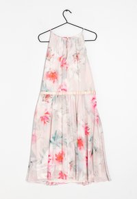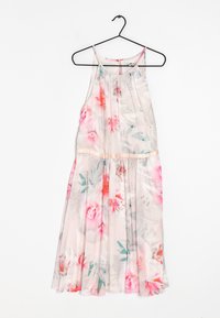Robe florale sans manches rose clair avec col licou sur un cintre noir, fond blanc.