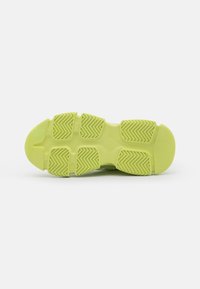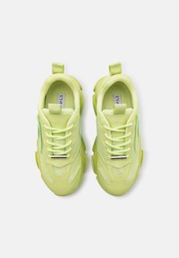 Baskets vert clair avec surfaces en mesh et lisses, dotées d'une semelle épaisse, d'accents métalliques et de coutures visibles. Portées avec un jean déchiré.