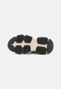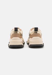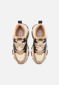 Baskets beige et noires avec une semelle épaisse, en mesh et matériau synthétique, accents texturés et lacets contrastants. Présentent un logo sur le côté.