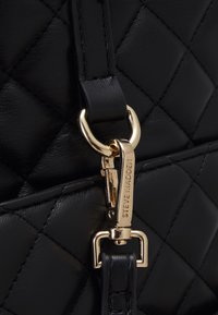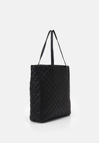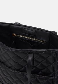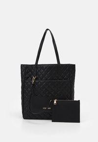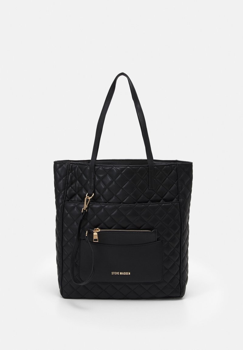 Sac cabas matelassé noir avec deux poignées, une poche avant zippée et l'inscription "Steve Madden" en lettres dorées sur la poche.