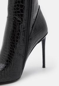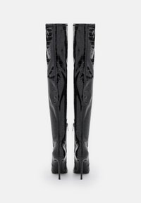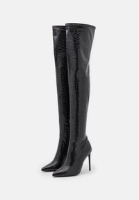 Bottes noires au-dessus du genou en matière vernie embossée façon croco, avec un bout pointu et un talon aiguille. Fermeture éclair latérale incluse.