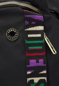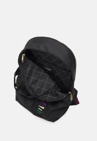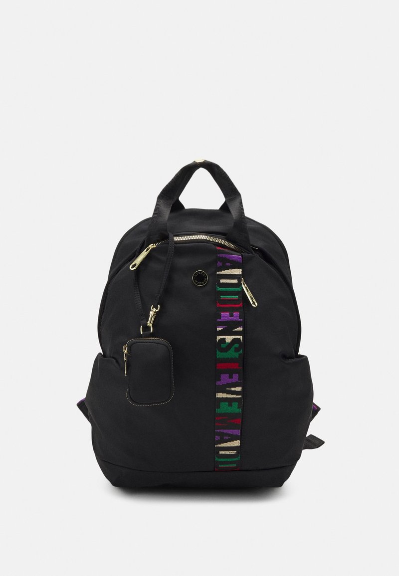 Sac à dos noir avec des fermetures éclair dorées, surface en tissu, une sangle rayée multicolore et une petite poche avant. Dispose de deux poignées supérieures et de bretelles.