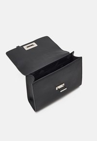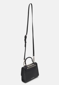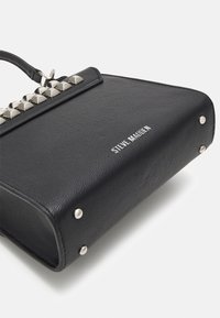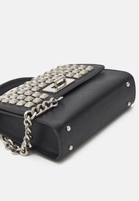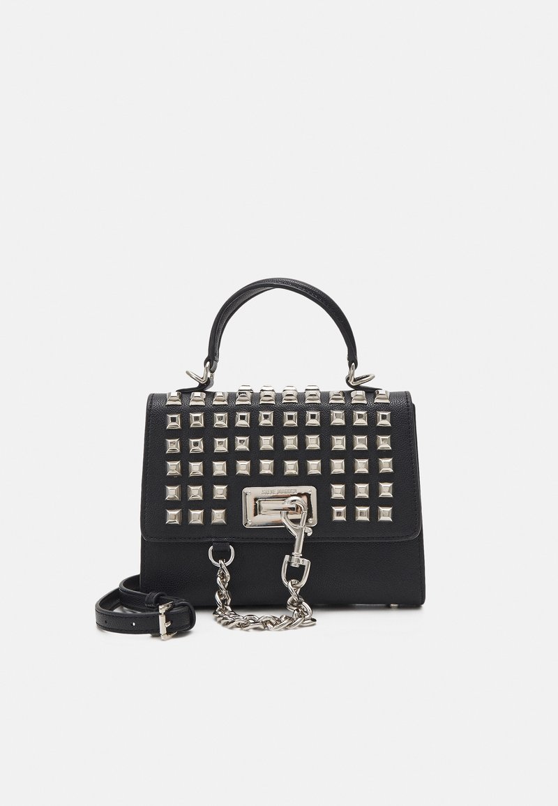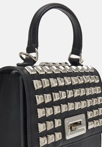 Sac à main en cuir noir avec clous carrés argentés, poignée supérieure, détail chaîne argentée et bandoulière amovible sur fond blanc.