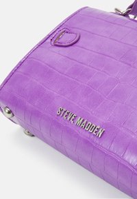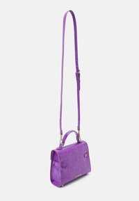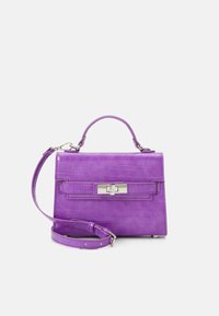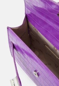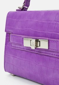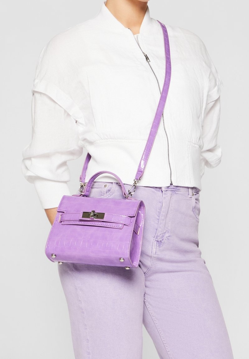 Femme portant une veste blanche à fermeture éclair et un jean violet clair, tenant un petit sac à main violet à texture crocodile avec une poignée supérieure et une bandoulière.