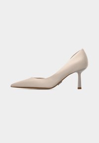 Chaussure à talon haut couleur crème flottant au-dessus d'un canapé en cuir argenté matelassé brillant, sans personnes ni actions visibles.