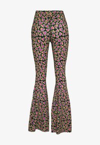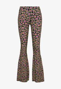 Pantalons évasés avec un fond noir présentant un motif de cœurs colorés en rose et vert. Fabriqués en tissu extensible avec une ceinture élastique.