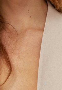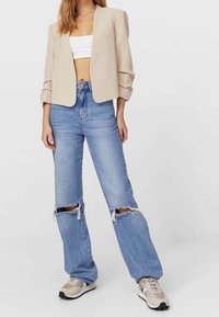 Femme portant un blazer beige ouvert, un crop top blanc et un jean taille haute bleu clair, debout devant un fond uni.