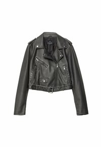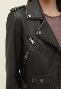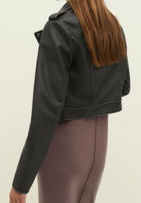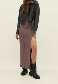 Femme portant une veste motard courte en cuir noir avec des fermetures éclair et des boucles argentées, par-dessus une robe moulante mauve avec une fente devant.