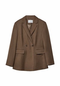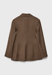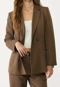 Blazer marron avec une coupe ajustée, revers crantés, fermeture à un bouton et poches latérales, associé à un haut blanc côtelé et un pantalon assorti.