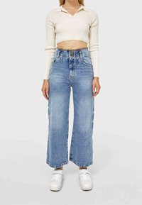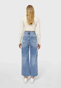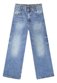 Jean denim bleu à jambes larges, doté d'une taille haute, de coutures apparentes et d'un ourlet brut. Porté avec des baskets blanches.