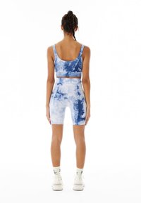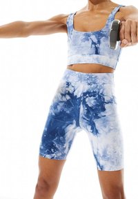Soutien-gorge de sport en tie-dye bleu et shorts taille haute assortis, design ajusté, matériau doux, texture lisse, avec des baskets blanches et des chaussettes.