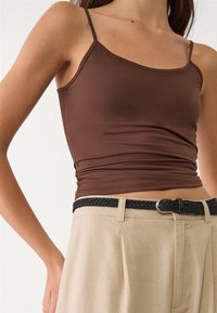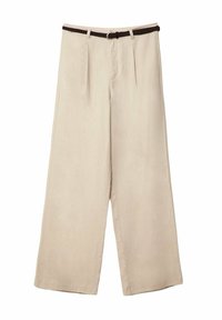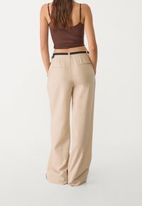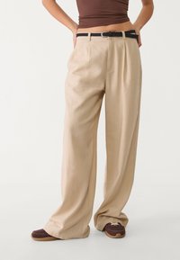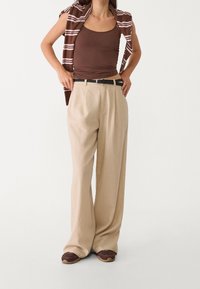 Personne portant un pantalon large beige avec une ceinture tressée noire et des baskets marron, se tenant avec les mains sur les hanches devant un fond blanc.