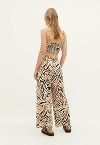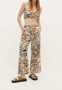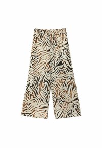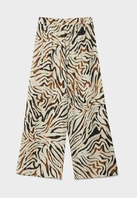 Pantalons larges en tissu beige avec des motifs de rayures de tigre noires et brunes. La taille est élastique avec un cordon de serrage.
