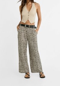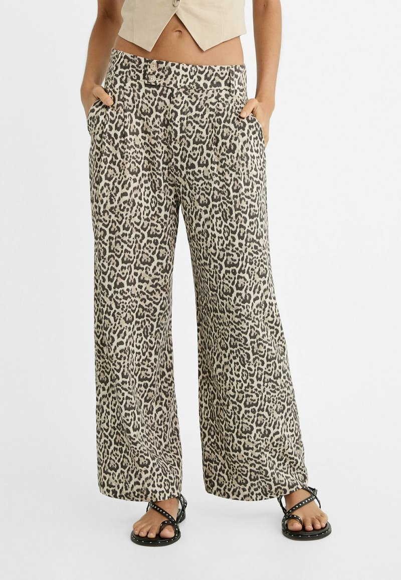 Pantalon large à imprimé léopard en beige et noir, avec une taille à cordon, des poches et un tissu léger. Motif texturé sur toute la surface.