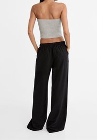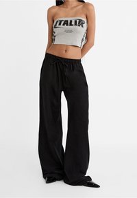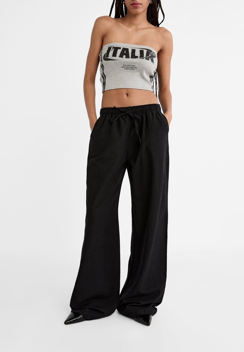Top court strapless gris avec un graphique noir "ITALIA", associé à un pantalon large noir avec une taille élastique et un cordon de serrage.