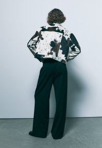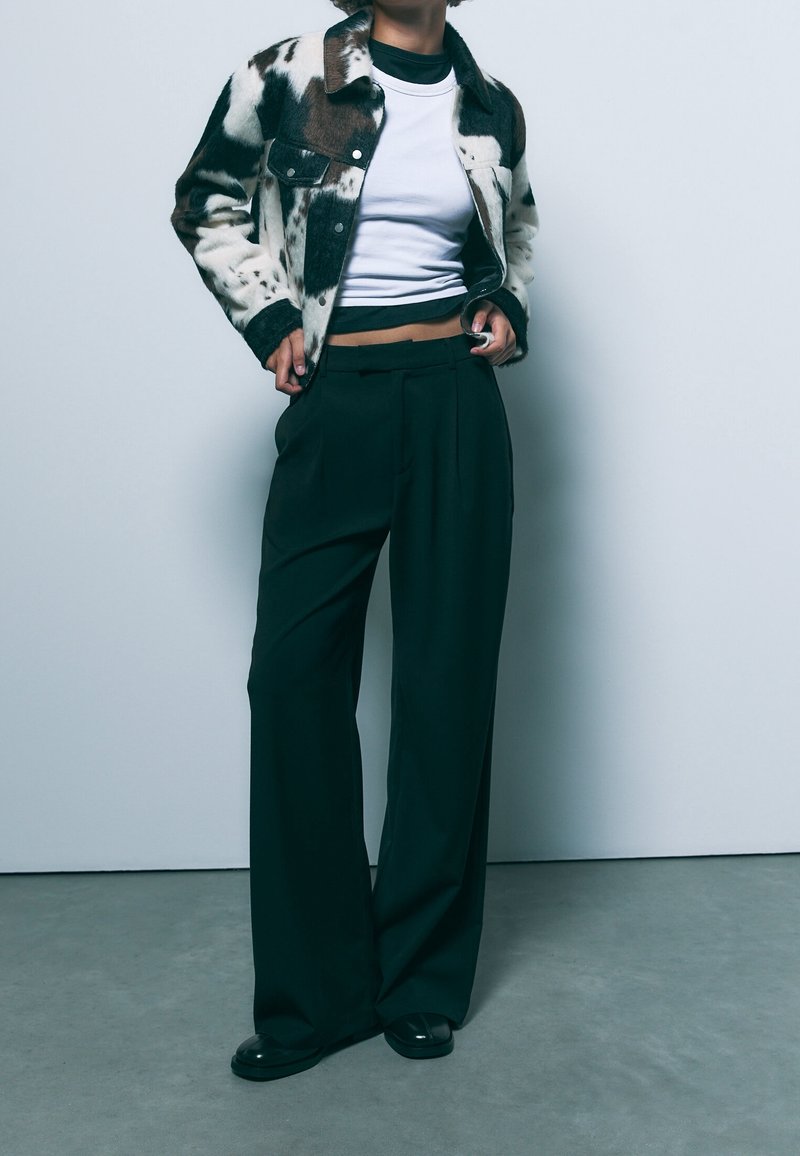 Veste en fausse fourrure avec imprimé vache marron et blanc, superposée sur un haut noir, associée à un pantalon large sombre et des chaussures noires.