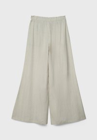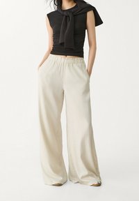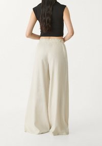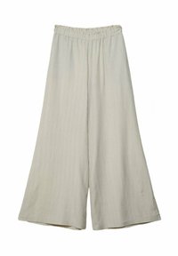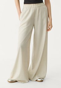 Pantalon à jambes larges couleur beige clair, avec des rayures verticales. Fabriqué dans un matériau doux avec une ceinture élastique et une coupe décontractée.