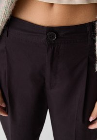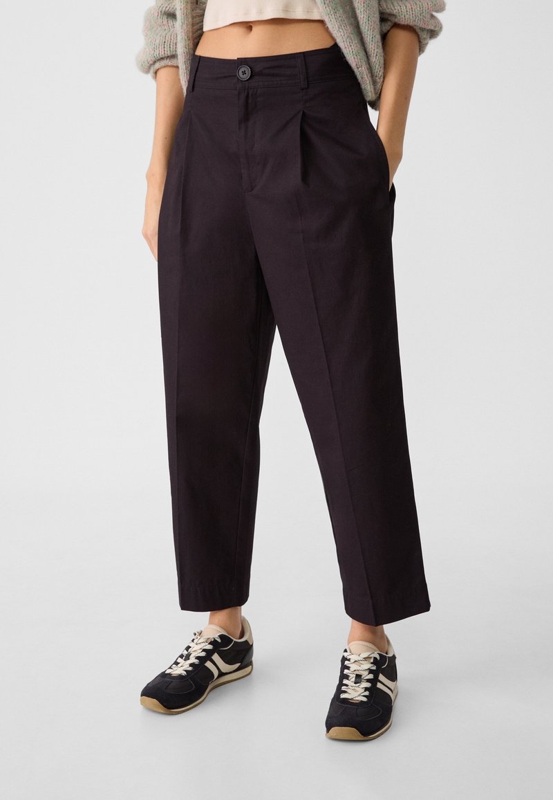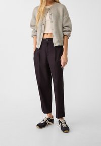 Personne portant un pantalon noir taille haute fuselé, un pull court et des baskets noires à lacets blancs, debout les mains dans les poches.