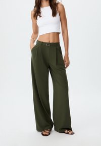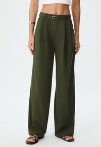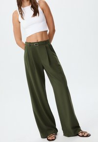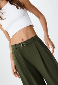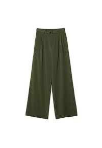 Pantalon vert à jambes larges en tissu lisse, avec des plis, une ceinture et une taille haute. Associé à des sandales plates.
