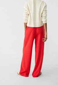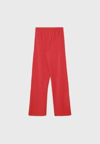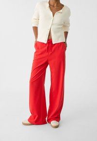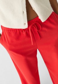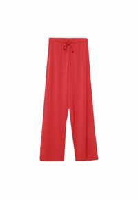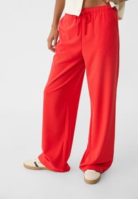 Pantalon large rouge en tissu lisse, avec une taille élastique et un cordon de serrage. Assorti à des baskets de couleur claire.
