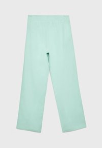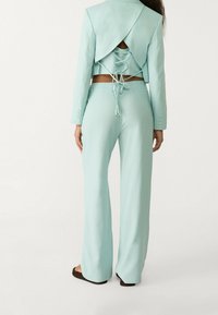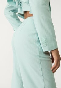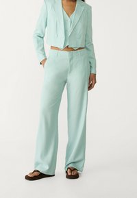 Un pantalon large bleu clair en tissu doux avec une texture lisse, comportant des poches en biais et une finition soignée. Assorti à des sandales en flip-flop brunes.