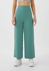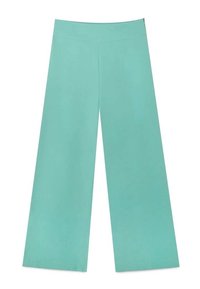 Pantalon à jambes larges de couleur bleu-vert discret, fabriqué dans un tissu doux à la texture lisse. Il présente une taille haute et des coutures latérales subtiles.