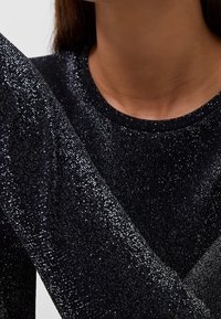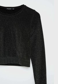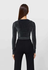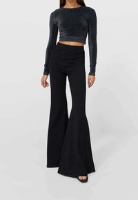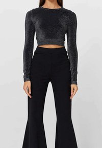 Femme portant un crop top moulant à manches longues noir pailleté et un pantalon noir évasé taille haute, devant un fond uni.