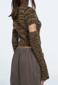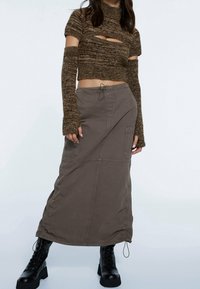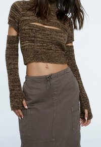 Haut court tricoté marron à manches longues avec un design découpé, associé à une jupe grise avec poches et taille à cordon.